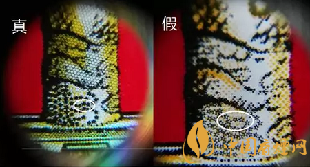 “中華”原產(chǎn)地標(biāo)志為藍(lán)色橢圓形,折光可見“中華”字樣、8顆“★”及天安門圖案。真煙色彩飽滿,圖案清晰;假煙色彩暗淡,圖案模糊。同時(shí)還可以借助圖中藍(lán)色線的走勢來區(qū)分真假煙。