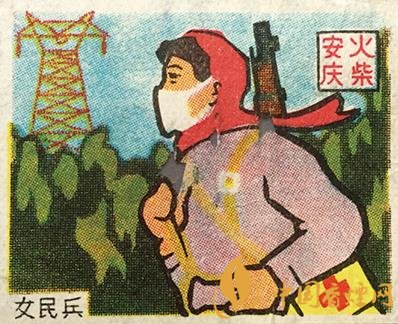 除了戴口罩的醫(yī)務人員形象外,火花上戴口罩的人物形象還有不少,如裹著冬裝的少年兒童、肩背藥箱的女民兵(圖3)、扛著掃帚的環(huán)衛(wèi)工人、在田間噴灑農(nóng)藥的科技人員、在食堂為餐具消毒的服務員等。南京火柴廠出品的“講衛(wèi)生”系列火花中,還替“惠山泥人”戴上了口罩(圖4)。