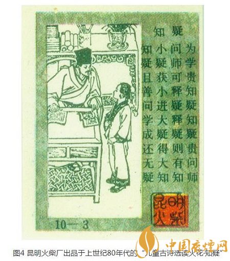 讀書學(xué)習(xí)貴在求教,一有疑問馬上向老師請教,以此獲得更大的進(jìn)步。上世紀(jì)80年代,昆明火柴廠十枚/套的“兒童古詩選讀”火花中,“知疑”(圖4)就定格于一名學(xué)童在向一名私塾先生提出自己的疑問后,傾聽私塾先生給他講解。畫面旁邊還配印有古詩“為學(xué)貴知疑,知疑貴問師。小疑獲小進(jìn),大疑得大知。知疑且善問,學(xué)成還無疑”。