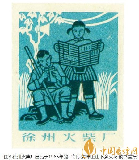 徐州火柴廠出品于同年的四枚/套的“知識青年上山下鄉(xiāng)”火花,“讀書看報(bào)”(圖8)一枚再現(xiàn)了一對知青利用休息間隙,在田間地頭讀書看報(bào)補(bǔ)充知識的畫面。