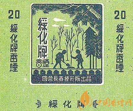 上世紀50年代,國營長春卷煙廠出品了“綠化牌”煙標。這枚煙標以綠色為底色,主版采用剪影的形式描繪了一幅植樹圖,畫面上一個人扶著樹苗,另外一個人揮鍬培土,不遠處是已經栽種好的一棵棵樹苗,在樹苗右上方,高大濃密的松樹如母親一般呵護著小樹苗;副版上印著“大家植樹 綠化祖國 護林防火 人人有責”的字樣。