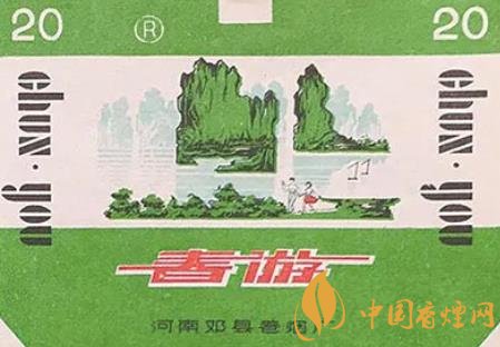 上世紀80年代,河南鄧縣卷煙廠出品的“春游”煙標,主版展現了山巒疊翠、水波蕩漾、帆影點點的迷人風光,在這美景中,兩個人手牽著手走在綠草如茵的岸邊,其中一個女孩身穿紅裙,為滿目的綠增添了一抹亮色,另一個人伸手指著前方,似乎正在指引伙伴欣賞這美麗的湖光山色。