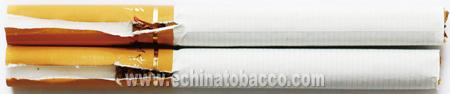煙支過(guò)濾嘴及煙絲差異對(duì)比:真煙煙支采用單一醋纖濾嘴,長(zhǎng)度為24mm,煙絲切絲寬度均勻,煙絲疏松、光澤油潤(rùn)性好、呈檸檬黃色,煙絲結(jié)構(gòu)為葉絲、膨脹梗絲和造紙法再造煙葉;假煙煙支過(guò)濾嘴較短,長(zhǎng)度約為20mm,制絲工藝粗糙,色澤發(fā)暗無(wú)光澤、煙絲中含碎末較多,大量梗絲未經(jīng)過(guò)膨脹處理,無(wú)造紙法再造煙葉,與真品特征存在明顯差異。