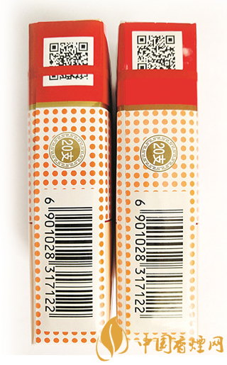 真煙商標紙色澤鮮艷,二維碼位置較低,“20支”字樣位置稍高。假煙商標紙色澤淺淡,二位碼位置較高,“20支”字樣位置稍低。