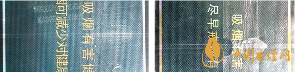 煙用包裝膜材質(zhì)及條形碼對比:真品卷煙條包裝膜材質(zhì)光滑,均勻無皺褶,條形碼區(qū)域呈淡黃色,套色均勻清楚。假煙條包裝膜材質(zhì)粗糙,有不均勻皺褶,條形碼區(qū)域為白色,套色邊緣放大后模糊不清。