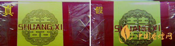 真假商標(biāo)紙顏色差異比對(duì):真品商標(biāo)紙顏色為深紅色,正面喜字燙金邊緣有凸起感;假煙商標(biāo)紙顏色多為鮮紅色,正面喜字為平版印刷且邊緣未見凸起感,與真品存在明顯差異。