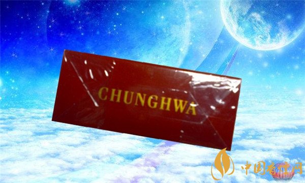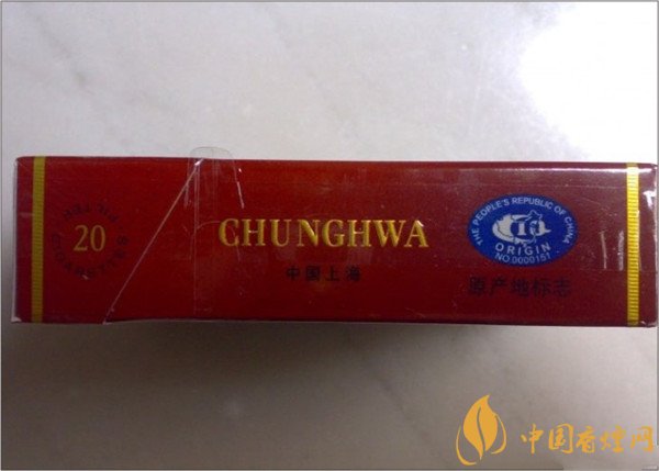 煙盒的左側(cè)標(biāo)注著英文字母“CHUNG HWA”和藍(lán)色的防偽標(biāo)簽。中華的出產(chǎn)方。